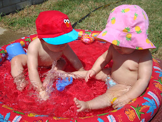 Today, I blew up their little pool and put them in their swimmers. No bathing suits needed.... since we were just in the back yard. I slathered on the sunscreen and put on their little hats. They were so excited!! I honestly think they knew they were going "swimming". They were all giggles and and smiles. It warms my heart to see them happy like that. I hope these memories WE are making are happy memories for them as they get older. 'Cause they are magical for me and their daddy!!